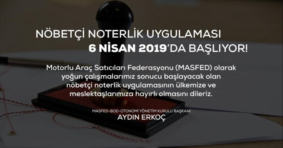13Mar 2019 by wpadmin FEDERASYONUMUZUN YOĞUN ÇALIŞMALARI NETİCESİNDE NÖBETÇİ NOTERLİK UYGULAMASI 6 NİSAN İTİBARIYLA UYGULANMAYA BAŞLIYOR