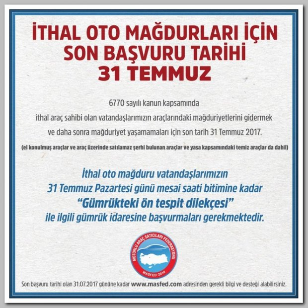 İTHAL OTO MAĞDURLARI İÇİN SON TARİH 31 TEMMUZ 2017!