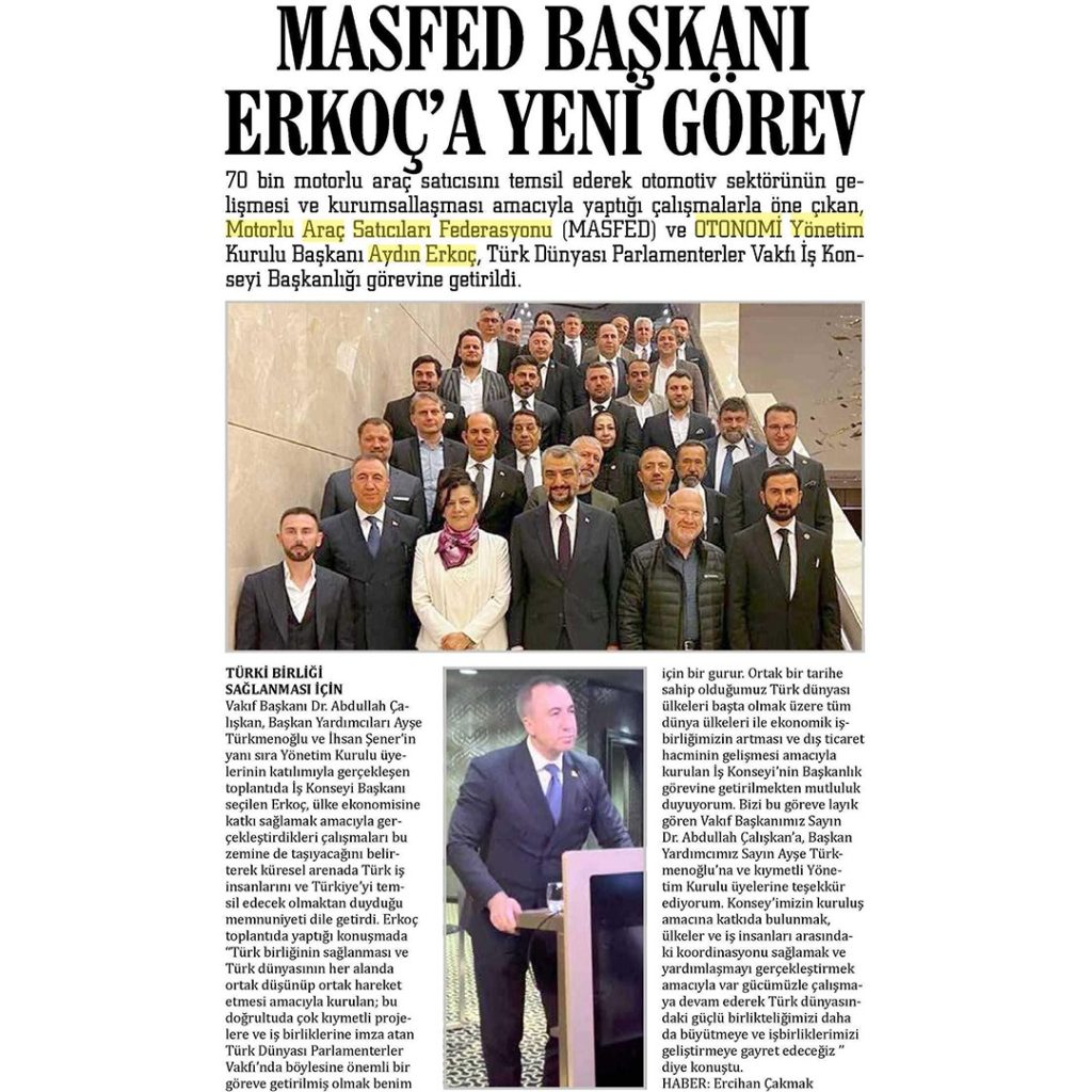 MASFED ve OTONOMİ Yönetim Kurulu Başkanımız Aydın Erkoç, Türk birliğinin sağlanması ve Türk dünyasının her alanda ortak düşünüp ortak hareket etmesi amacıyla kurulan ve bu doğrultuda çeşitli faaliyet ve projeler gerçekleştiren Türk Dünyası Parlamenterler Vakfı’nın İş Konseyi Başkanlık görevine getirilmiştir.